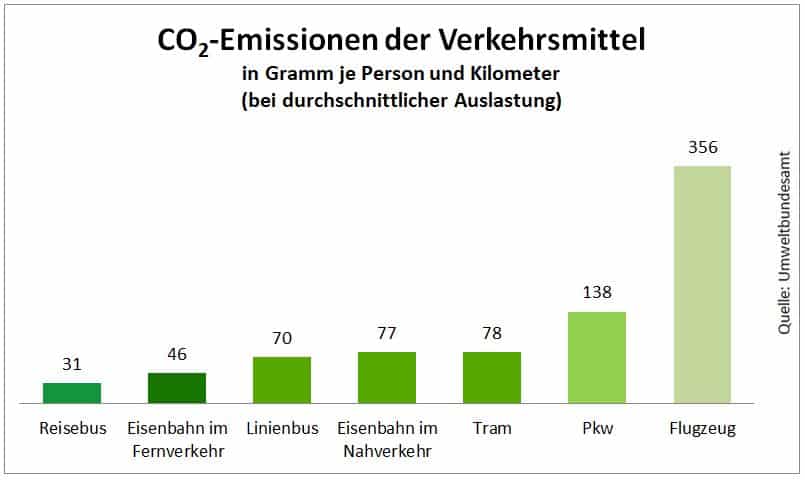 Wie hoch dabei der Ausstoß von CO2 je Person und Kilometer bei den einzelnen Verkehrsmitteln ausfällt, zeigt die nachfolgende Grafik: